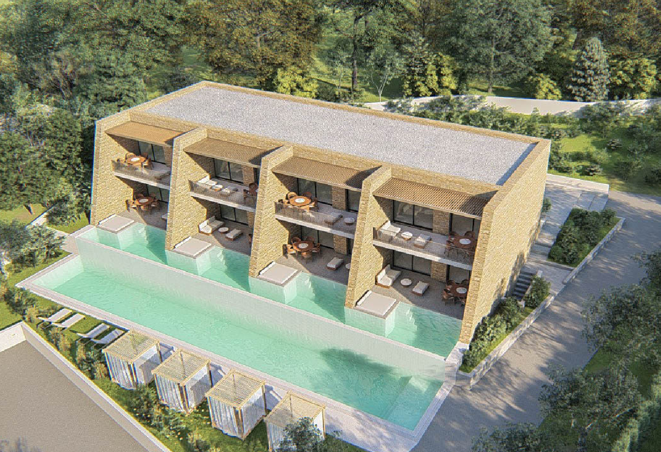 Vor dem Gebäude werden sich direkt anschließend die Pool-Terrassen und der lange Gemeinschaftspool sowie eine gegenüberliegende Lounge-Area befinden, der Abstellbereich für Autos wird sich aufgrund der leichten Hanglage etwas tiefer gelegen kaum bemerkbar machen und erweitert den Abstand zwischen Gebäude und Straße umso mehr.