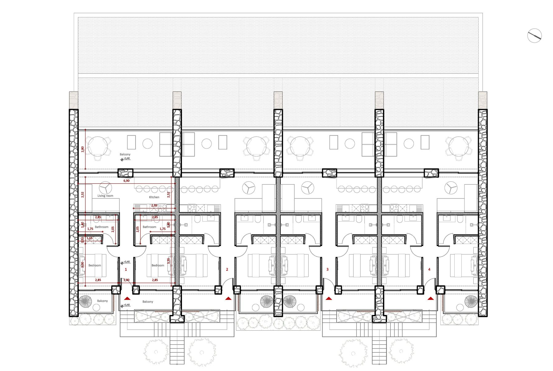 Zugang zu den Apartments erfolgt über die Rückseite, auf der jedes der Schlafzimmer eine kleine eigene Terrasse hat.
